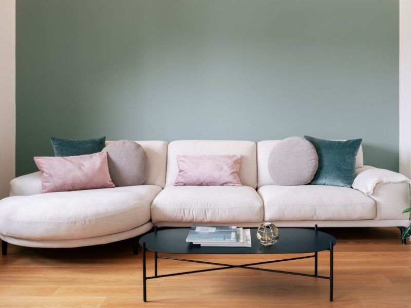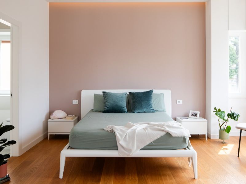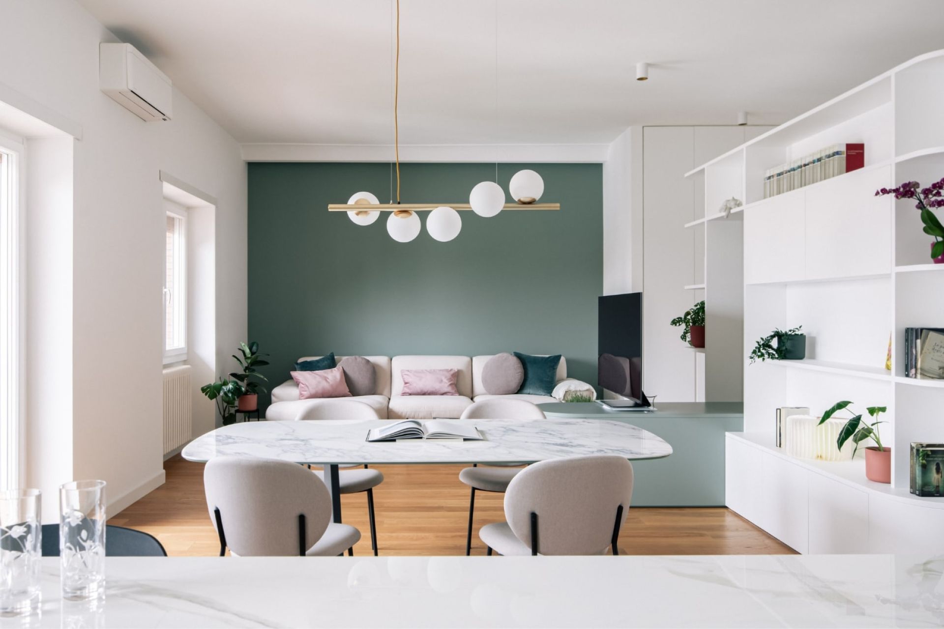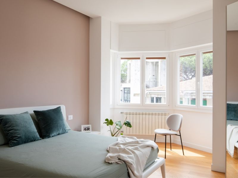 Il salotto è un invito alla convivialità, grazie al divano con chaise longue in grigio chiaro, incorniciato da una parete verde. La camera da letto è un rifugio intimo e luminoso, impreziosito dalla bow window e da dettagli in rosa antico e verde salvia. La scelta accurata dei materiali – parquet, gres effetto resina, marmo e ottone – si riflette in tutta la casa, offrendo bellezza, comfort e facilità di manutenzione.