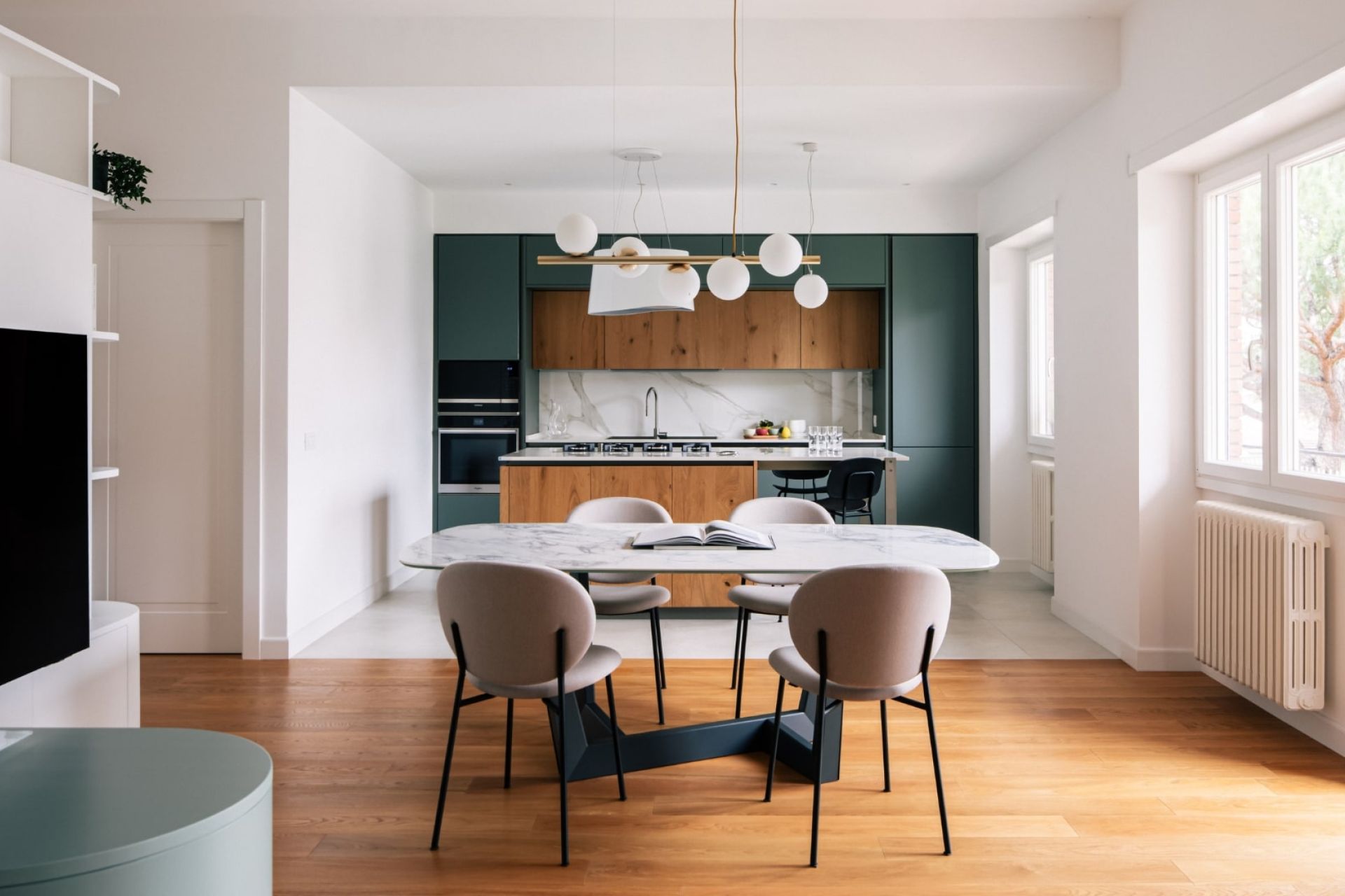 In questa residenza immersa nel verde di Via Cassia, la cucina Veneta Cucine si distingue per la combinazione equilibrata tra materiali pregiati e colori delicati. Il parquet in legno miele e il top in marmo Calacatta conferiscono calore ed eleganza, mentre le tonalità pastello – rosa antico, verde salvia e verde Minerva – creano un ambiente accogliente e rilassante. L’isola centrale diventa il fulcro funzionale e decorativo della zona cucina, perfettamente integrata con il resto della casa.
