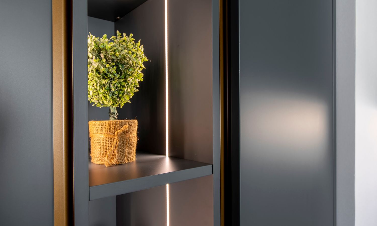 Per valorizzare il blu senza spezzarne l’armonia, abbiamo inserito gole in finitura bronzo a contrasto: un tocco prezioso che sottolinea le linee della cucina e crea un armonioso gioco di profondità. Inoltre, per regalare maggiore movimento e leggerezza alla composizione, è stato aggiunto l’elemento a giorno Groove, un binario luminoso su cui scorrono mensole, porta calici e altri piccoli accessori, tutti elementi che sanno seguire e incontrare le esigenze della famiglia e rendere viva la cucina. La casa di Flaminia è luminosa e accoglie la luce in un modo straordinario: ecco perché abbiamo voluto replicare quest’atmosfera anche con gli elementi della cucina. Tra le due colonne principali ne è stata posizionata una a giorno illuminata, pensata proprio per creare un punto di respiro visivo. La luce fresata sui lati riesce infatti a evidenziare i volumi e dona equilibrio all’intera composizione. Infine, lo schienale in vetro retroilluminato completa tutto, esalta il blu e dona profondità senza appesantire. Una luce che accompagna, mai invadente, perfetta per creare atmosfera.