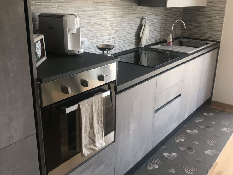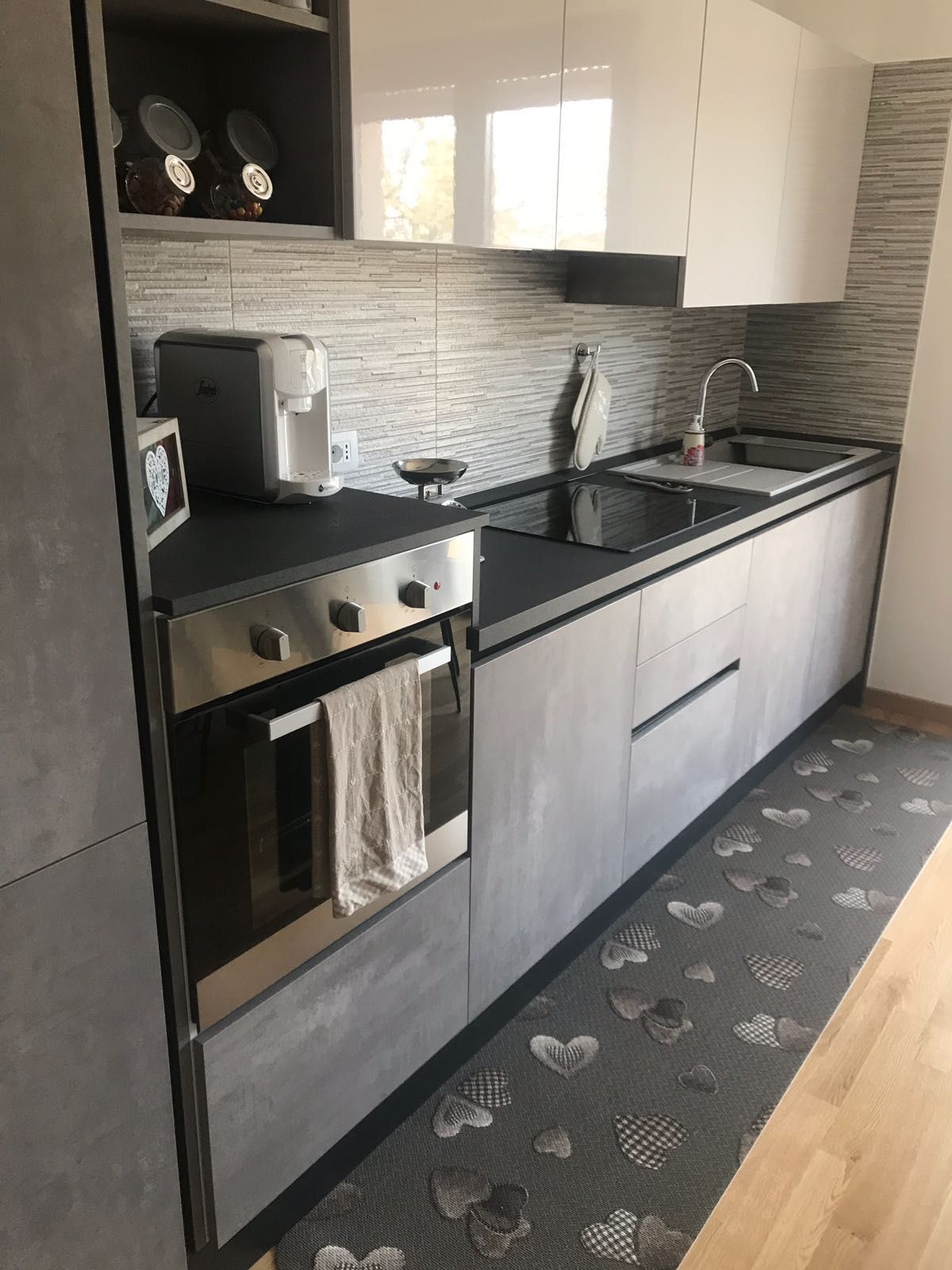 Parete attrezzata Forma 2000, basi e colonne modello colibrì, cemento grey, pensili modello Nice sand lucido e top lavagna.