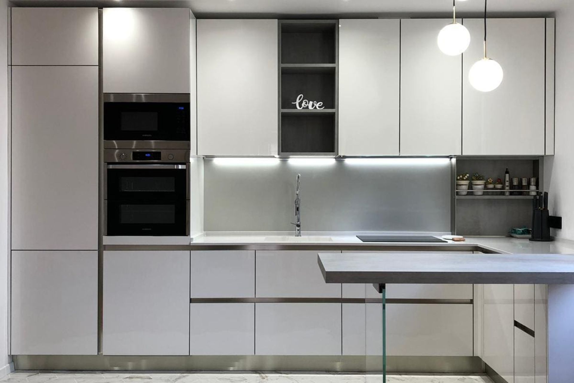 🔴 Piano penisola in finitura beton grigio e supporto per piano penisola in vetro trasparente