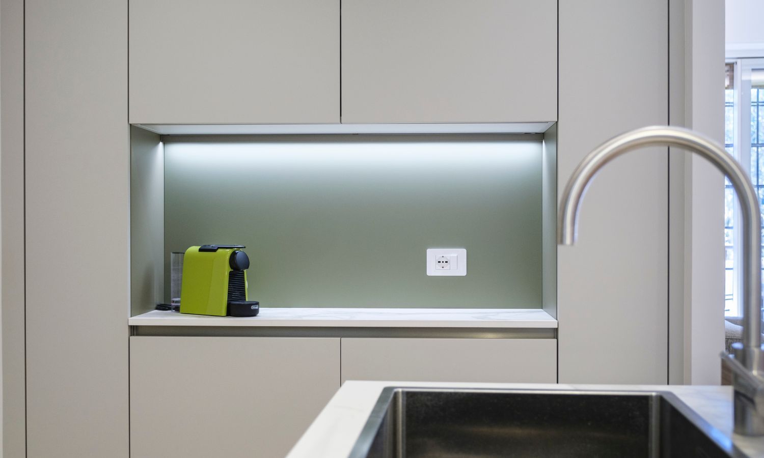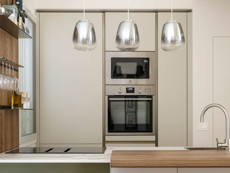 L’illuminazione che sovrasta il lavello e il piano di lavoro è integrata da tre punti luce che pendono come gocce di design, focalizzandosi sul piano senza abbagliare. Accanto, la zona forno si integra in una colonna compatta, lasciando spazio a prese smart e rubinetto orientabile per un uso intuitivo.
