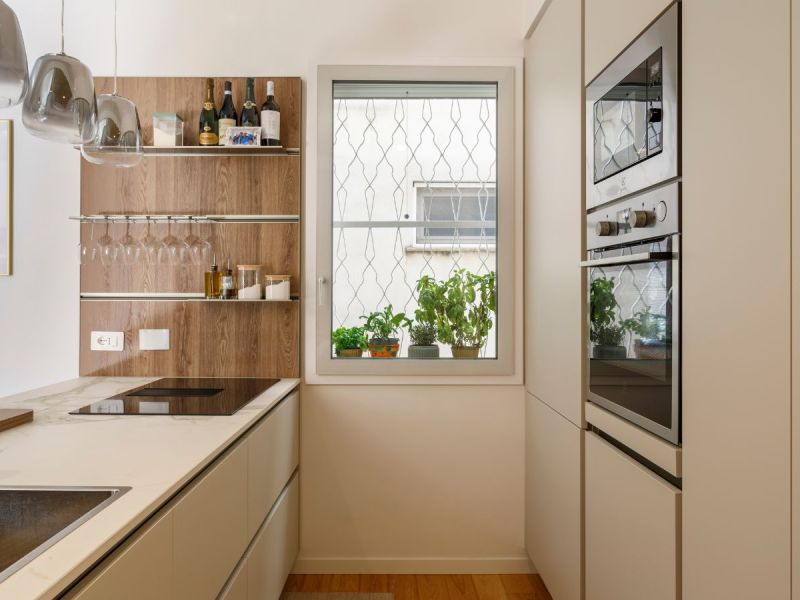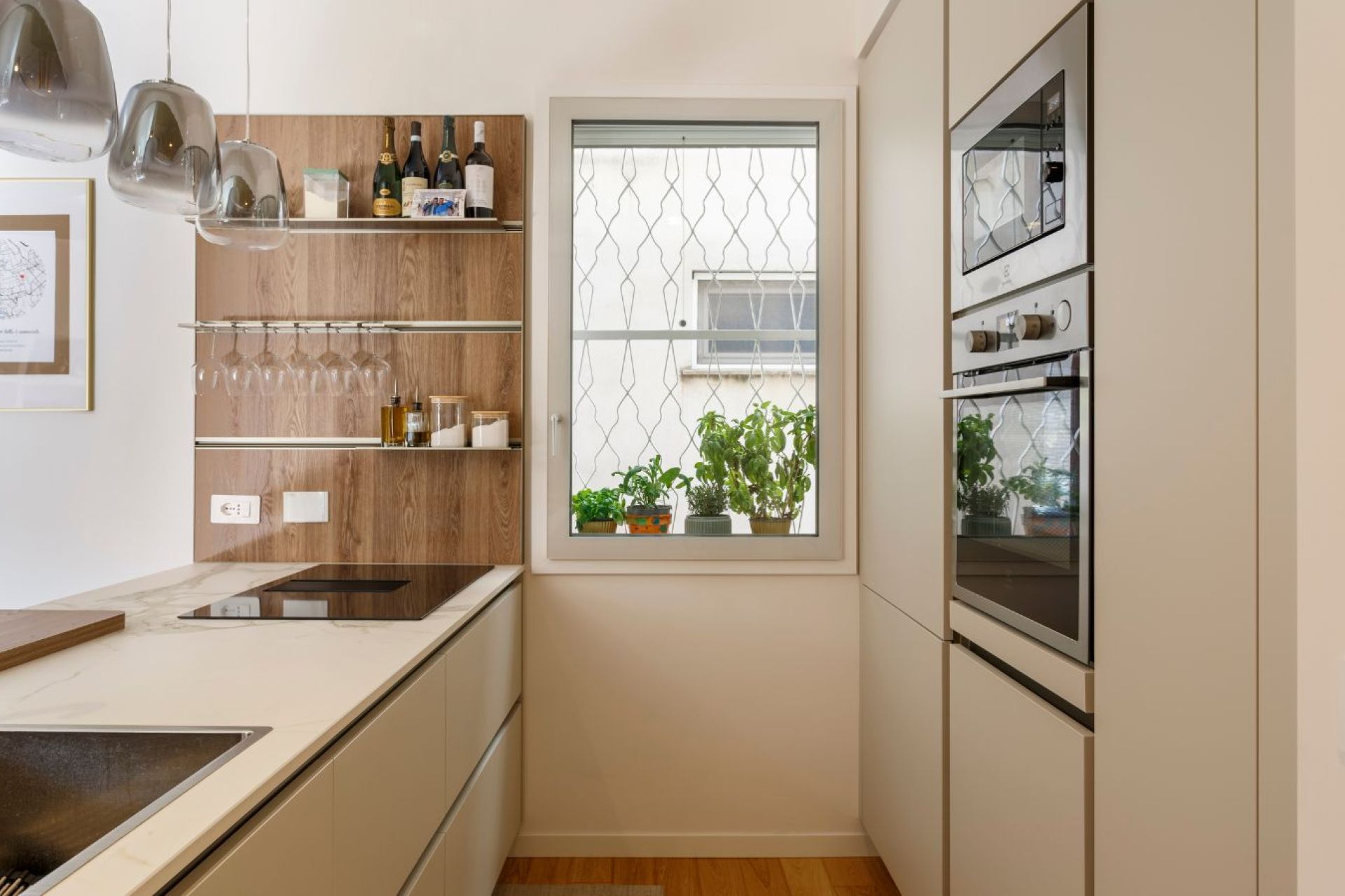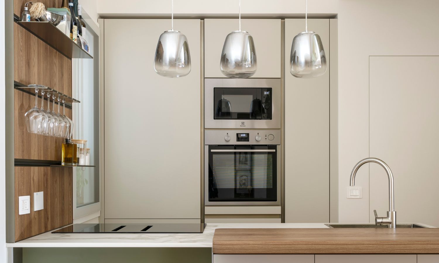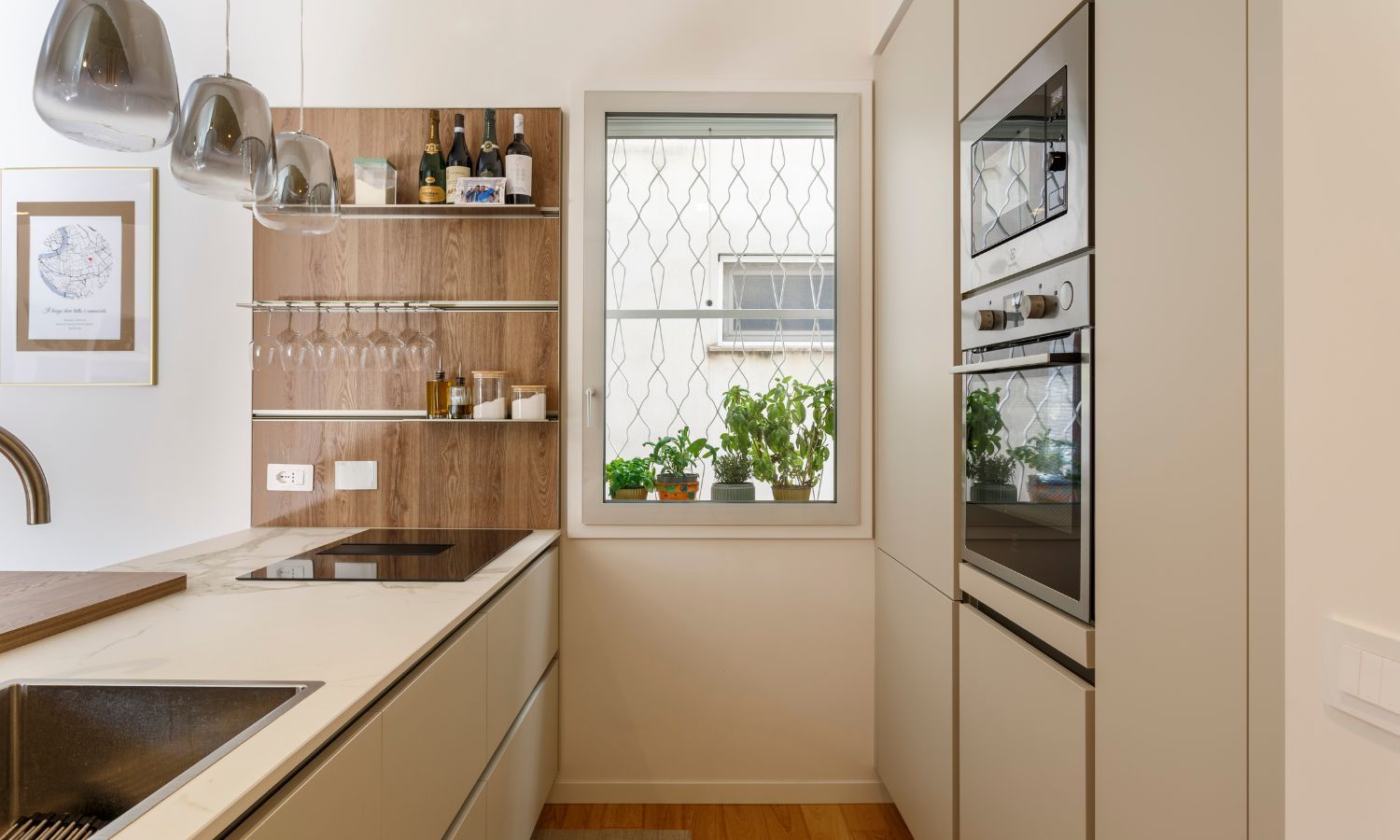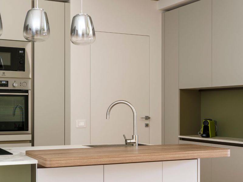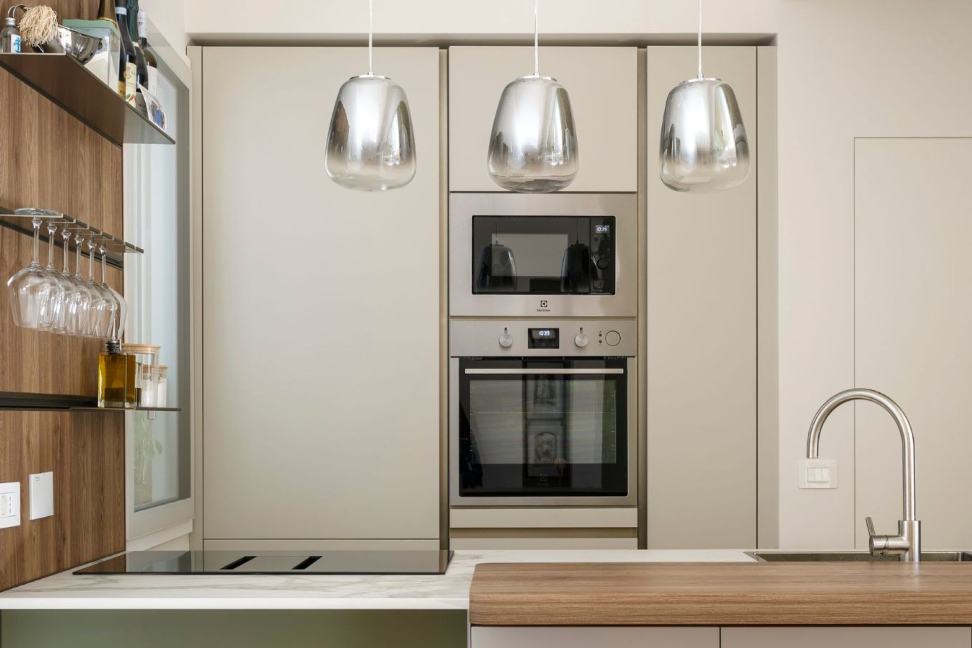 Ci sono cucine che sussurrano storie di colazioni lente e cene improvvisate, dove il legno caldo incontra la purezza dei colori tenui e la luce naturale filtra dalle grandi finestre. Non è più solo uno spazio per cucinare: è il cuore discreto di una casa che respira armonia, tra il profumo di caffè fresco e il tintinnio dei bicchieri pronti per un brindisi. Un ambiente lineare, funzionale ma elegante, con la composizione che sembra avvolgere la penisola per creare uno spazio accogliente e riservato, intimo.