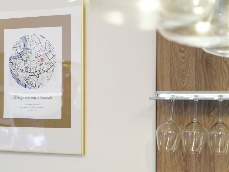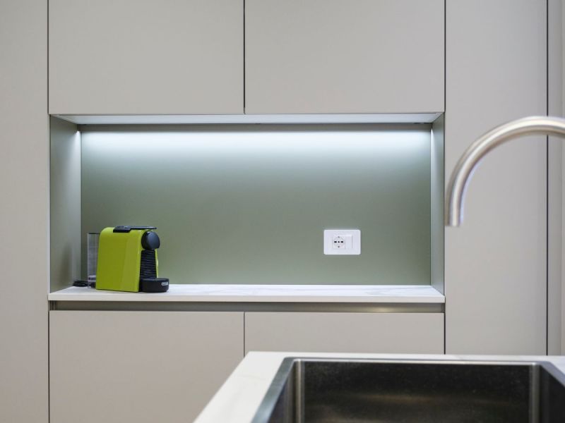 Il top Caranto in ceramica, finitura Calacatta naturale, definisce le zone operative e si integra alla perfezione con gli altri elementi come il piano cottura a induzione con cappa incassata e l’ampio lavello a vasca unica, per garantire un flusso perfetto e armonico nei gesti di chi cucina. La combinazione dello StepSystem con mensoline in Laccato Verde Avocado e dello schienale Groove in finitura Rovere realizza un tepore naturale: qui bottiglie di vino, oli e spezie diventano decorazione viva.