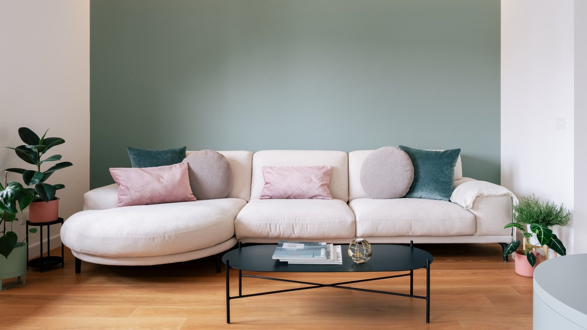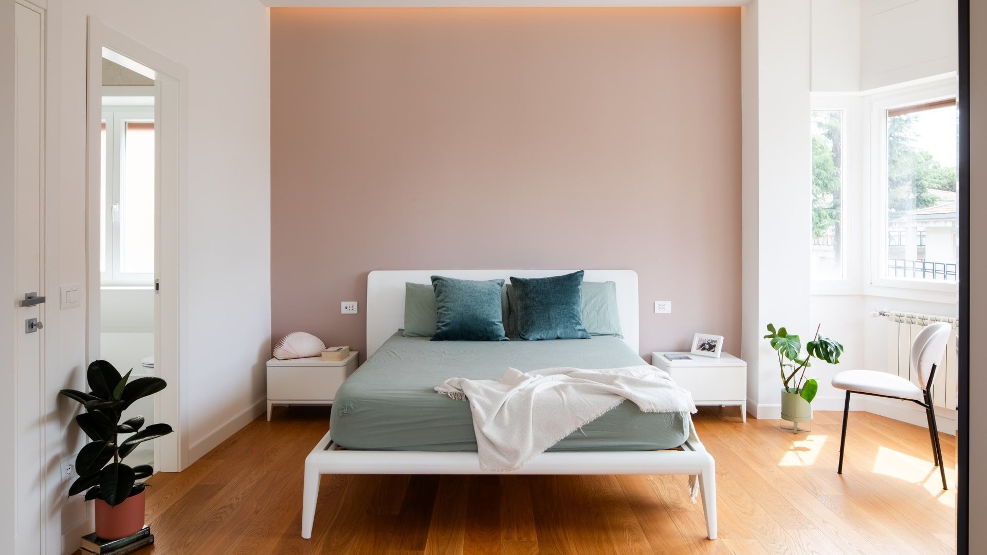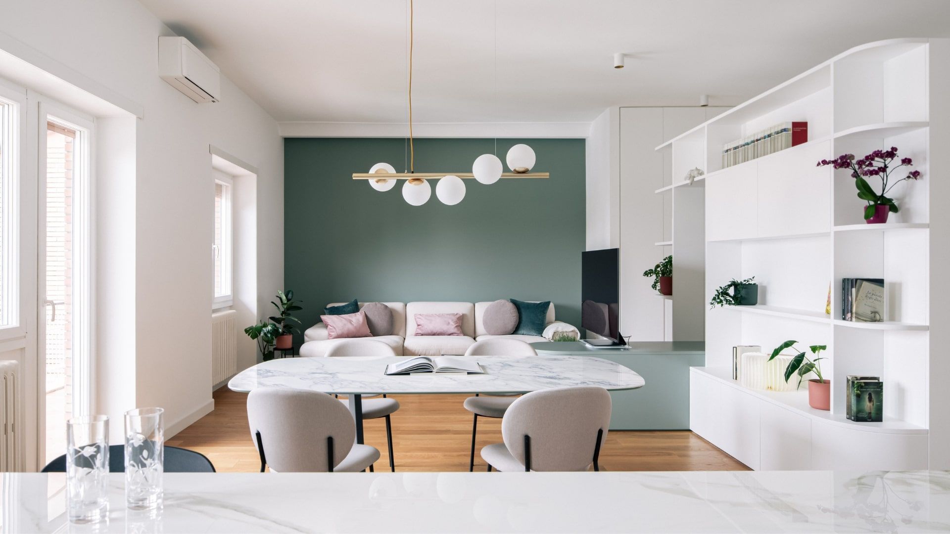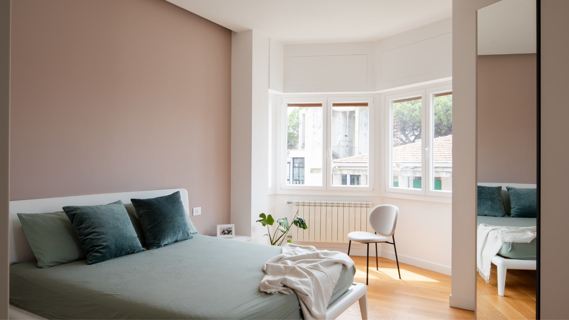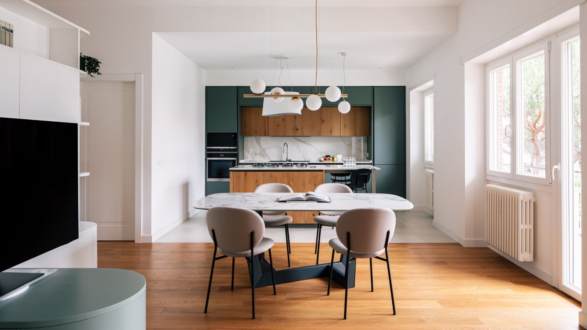 Il salotto è un invito alla convivialità, grazie al divano con chaise longue in grigio chiaro, incorniciato da una parete verde. La camera da letto è un rifugio intimo e luminoso, impreziosito dalla bow window e da dettagli in rosa antico e verde salvia. La scelta accurata dei materiali – parquet, gres effetto resina, marmo e ottone – si riflette in tutta la casa, offrendo bellezza, comfort e facilità di manutenzione.