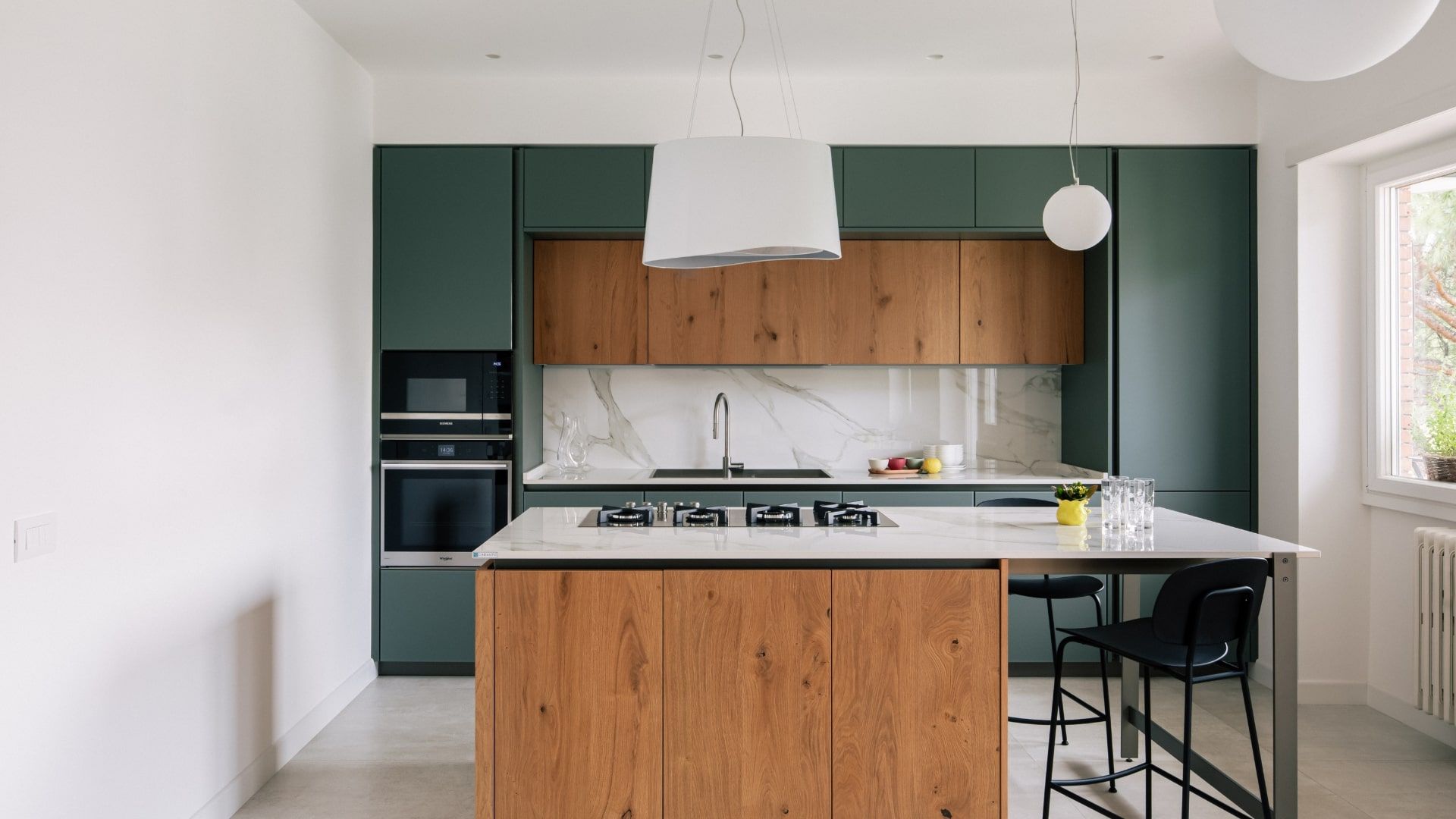 In questa residenza immersa nel verde di Via Cassia, la cucina Veneta Cucine si distingue per la combinazione equilibrata tra materiali pregiati e colori delicati. Il parquet in legno miele e il top in marmo Calacatta conferiscono calore ed eleganza, mentre le tonalità pastello – rosa antico, verde salvia e verde Minerva – creano un ambiente accogliente e rilassante. L’isola centrale diventa il fulcro funzionale e decorativo della zona cucina, perfettamente integrata con il resto della casa.