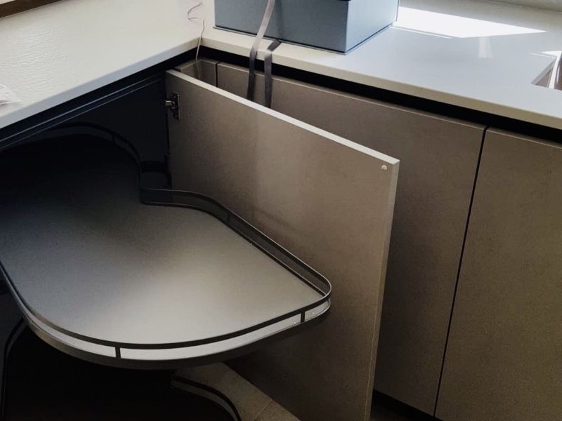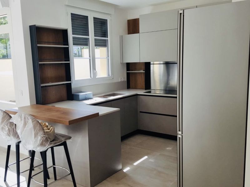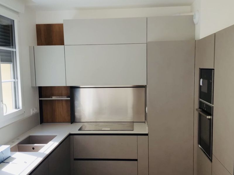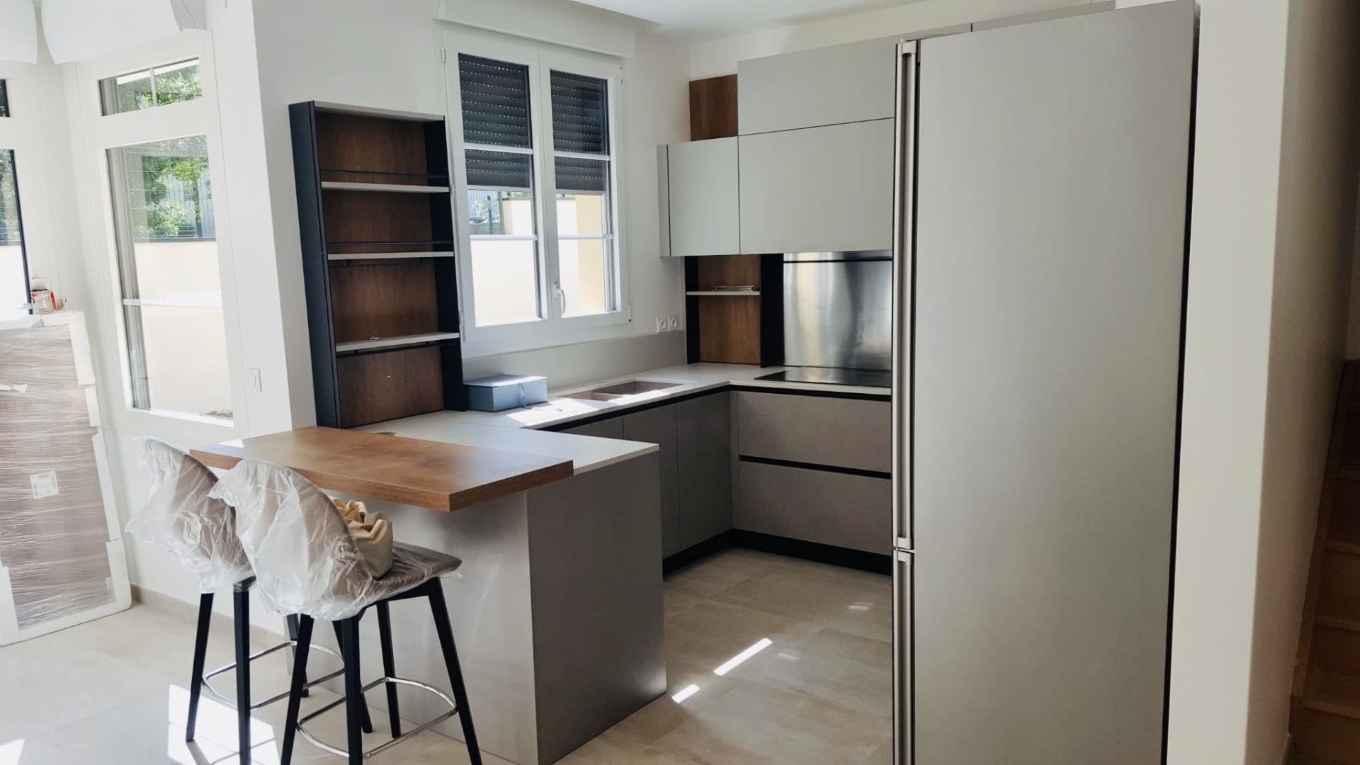 Cucina VENETA CUCINE Start Time J, con basi e colonne in Graffiato Scuro e pensili in Smart Grigio Colorboard. Inserti (schienali e mensoline) in leccio cognac decorativo. Gola in alluminio finitura brunito. Top in quarzo in finitura Spacco bianco”, completo di alzatina sul lato lavello e sul lato pilastro. Pacchetto elettrodomestici NEFF. Sgabelli Connubia Calligaris, Academy Wood.