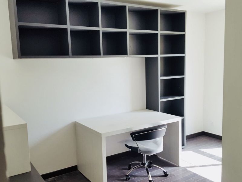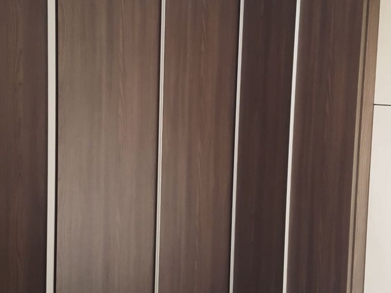 Armadio Cinquanta3 cameretta con maniglia a tutta altezza in finitura Olmo tabacco. Studio Cinquanta3 in finitura Olmo Shade/Lavagna.