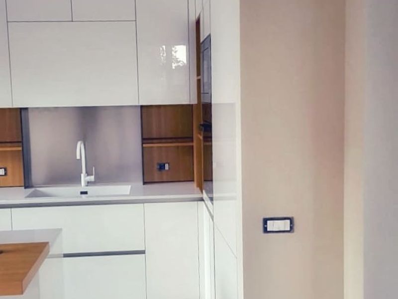 • Top Caranto Quartz lucido, finitura bianco perlato, con giunzione invisibile.